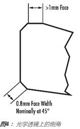 倒角的*常見切割角度為45°,并且該表面寬度是由光學產(chǎn)品的直徑來確定的。 其直徑小于3.00mm的光學產(chǎn)品(如微透鏡或微棱鏡)通常不需要切成倒角,這是因為很可能會在切削的過程中產(chǎn)生邊緣缺口。值得注意的是,對于很小的曲率半徑,例如,當透鏡的直徑大于等于0.85 x曲率半徑時,無需切成倒角,這是因為透鏡表面和邊緣之間會形成很大的角度。對于所有其他直徑,表1提供了*大的表面寬度。