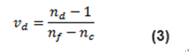 玻璃的另一種材料屬性是色散系數(shù),用于量化玻璃呈現(xiàn)的色散量。它是材料在f (486.1nm)、d (587.6nm) 和c (656.3nm)波長時的折射率(方程式3)。