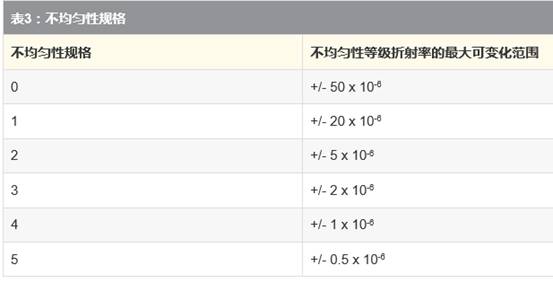 某種介質(zhì)的折射率是指光在真空中的速度與光在介質(zhì)中的速度之比。玻璃的折射率范圍一般在1.4-4.0之間,與針對紅外線優(yōu)化的玻璃相比,可視玻璃的折射率范圍要小一些。例如,N-BK7(一種通用的可視玻璃)的折射率為1.517,然而鍺(一種通用的紅外玻璃)的折射率為4.003。有關(guān)紅外材料的更多信息,請參閱“紅外 (IR) 應用領(lǐng)域使用的正確材料”。光學玻璃的折射率是一種重要屬性,因為光學表面的功率是從表面的曲率半徑和表面任意一側(cè)上的介質(zhì)折射率之差得來的。玻璃制造商指定的不均勻性是指玻璃折射率的變化。不均勻性是根據(jù)不同的等級來指定的,其中等級和不均勻性是互為相反關(guān)系的,隨著等級的增加,不均勻性則會減少(表3)。