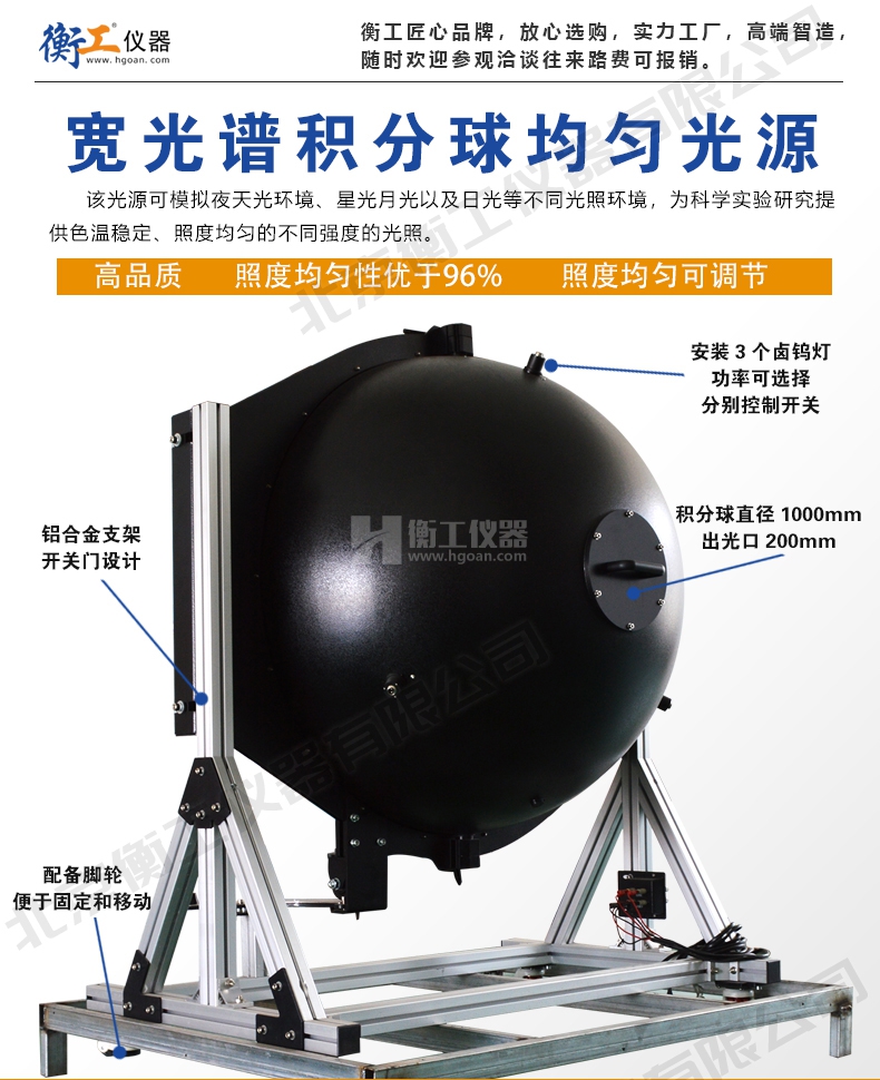 衡工積分球可適應(yīng)不同光強(qiáng)度需要,球心處設(shè)計(jì)樣品安裝支架,方便用戶在球心放置不同樣品,積分球開關(guān)門設(shè)計(jì),方便更換樣品,配備腳輪方便固定和移動(dòng)。