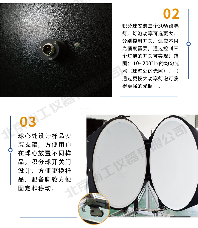 5、球心處設(shè)計(jì)樣品安裝支架,方便用戶在球心防止不同樣品。積分球開關(guān)門設(shè)計(jì),方便更換樣品,配備腳輪方便固定和移動(dòng)。