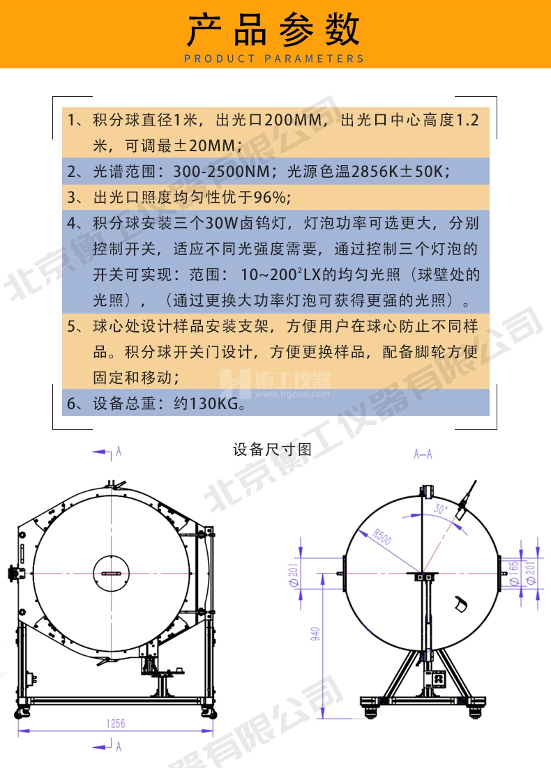 1、積分球直徑1米,出光口200mm,出光口中心高度1.2米,可調(diào)最±20mm。