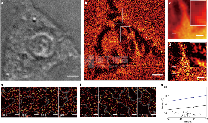 該研究團(tuán)隊(duì)進(jìn)而將技術(shù)應(yīng)用于生物細(xì)胞顯微成像,以細(xì)胞的基質(zhì)黏附為對(duì)象,對(duì)其進(jìn)行單分子電致化學(xué)發(fā)光成像,觀察其隨時(shí)間的動(dòng)態(tài)變化,成像結(jié)果與熒光超分辨成像可關(guān)聯(lián)對(duì)比,其分辨率也可與熒光超分辨成像相媲美。