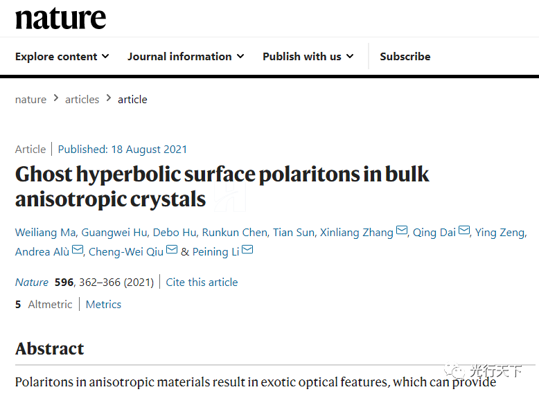 近日,國際頂級期刊《自然》刊發(fā)了華中科技大學武漢國家光電研究中心/光學與電子信息學院李培寧教授和張新亮教授研究團隊題為《Ghost hyperbolic surface polaritons in bulk anisotropic crystals》的研究論文。李培寧、張新亮教授團隊同新加坡國立大學、國家納米科學中心、紐約州立大學等單位合作,突破性證明了傳統(tǒng)的雙折射晶體中存在“幽靈”雙曲極化激元電磁波,該成果革新了極化激元基礎物理的“教科書”定義,對凝聚態(tài)物理、光物理、電磁學等領域的基礎原創(chuàng)研究具有重要指導意義。