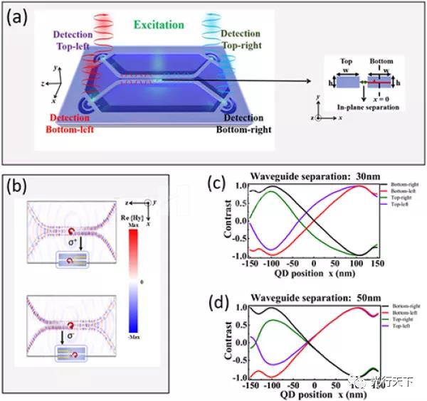 圖2.手性光子分束器件的設(shè)計(jì) (a)手性光子器件示意圖 (b)嵌入波導(dǎo)手性點(diǎn)處的兩個(gè)不同圓極化偶極子激勵(lì)源激發(fā)的波導(dǎo)模場(chǎng)分布 (c)和(d)波導(dǎo)間距為30 nm和50 nm時(shí),手性對(duì)比度隨偶極子位置的變化