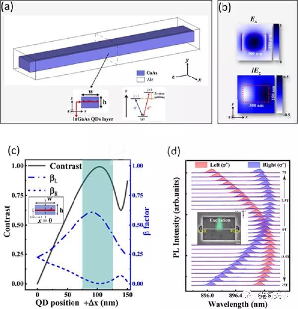 圖1.納米梁波導(dǎo)中的手性。(a)嵌入InGaAs量子點(diǎn)的GaAs納米梁波導(dǎo)示意 (b)波導(dǎo)橫截面上電場(chǎng)分布 (c)耦合效率和手性對(duì)比度隨偶極子位置的變化 (d)施加-7 T到7 T的磁場(chǎng),從左右兩側(cè)光柵耦合器分別收集到的量子點(diǎn)的圓極化熒光光譜