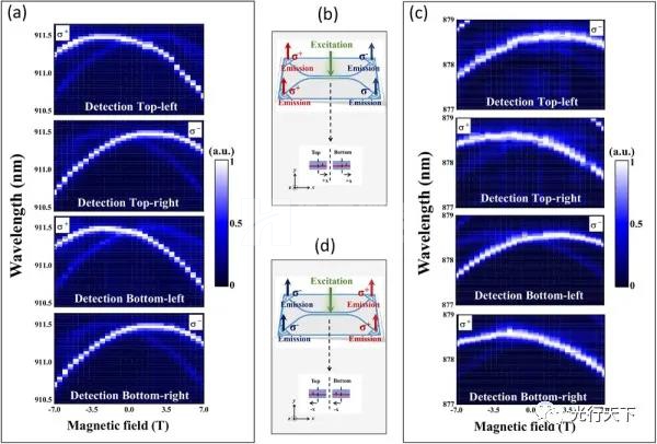 圖3.不同手性光子電路中具有確定性自旋傳輸手性行為的實(shí)驗(yàn)結(jié)果 (a)和(b)左旋圓偏振光從左側(cè)兩個(gè)光柵耦合器輸出,右旋圓偏振光從右側(cè)兩個(gè)光柵耦合器輸出 (c)和(d)改變量子點(diǎn)的位置后,特定圓偏振光子從與上述相反方向的傳輸路徑輸出,即左旋圓偏振光從右側(cè)兩個(gè)光柵耦合器輸出,右旋圓偏振光從左側(cè)兩個(gè)光柵耦合器輸出。