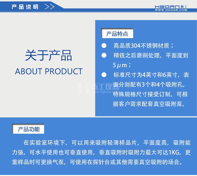衡工真空卡盤,在實(shí)驗(yàn)室環(huán)境下,可用來(lái)吸附輕薄樣品片,平面度高,吸附能力強(qiáng),可水平使用,也可垂直使用,垂直吸附時(shí)吸附力最大可達(dá)1KG,更重樣品是可更換氣泵,可使用在探針臺(tái)或其他需要吸附的場(chǎng)合。