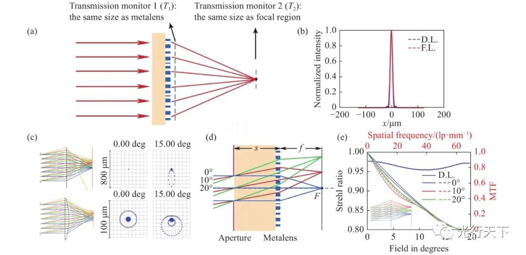 圖1. 超表面透鏡像差分析。(a)聚焦效率計(jì)算示意圖。(b)超表面透鏡焦平面電場(chǎng)分布圖,其中藍(lán)色、紅色曲線分別代表衍射極限下的焦平面電場(chǎng)分布和超表面會(huì)聚透鏡焦平面電場(chǎng)分布。(c)雙曲相位分布衍射平面(上)和傳統(tǒng)球面單透鏡(下)的光學(xué)系統(tǒng)示意圖及其對(duì)應(yīng)的點(diǎn)列圖。(d)消軸外像差超表面透鏡結(jié)構(gòu)。(e)衍射光學(xué)元件的斯特列爾比分布及不同入射角下的調(diào)制傳遞函數(shù)(MTF)。