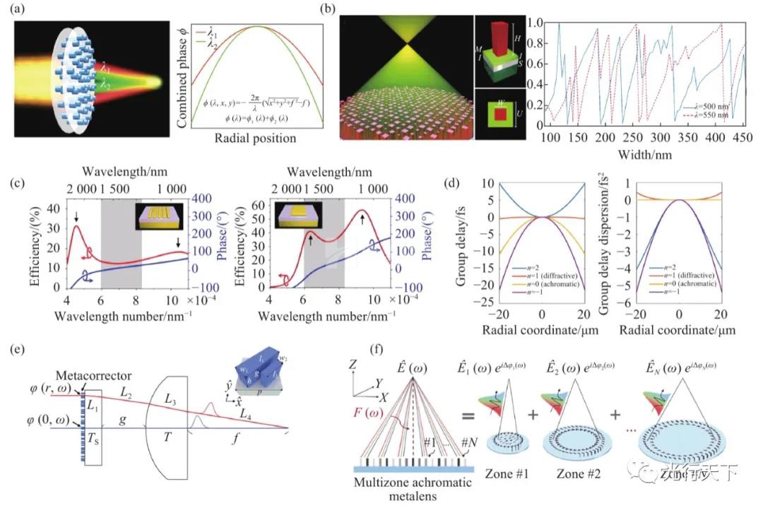 圖3. 消色差超表面透鏡設(shè)計(jì)。(a)將兩個(gè)不同波長(zhǎng)的光聚焦在同一位置的超表面級(jí)聯(lián)透鏡示意圖。每層超表面的相位共同提供了兩個(gè)不同波長(zhǎng)下所需的雙曲線相位分布。(b)反射式消色差超表面透鏡示意圖(左)以及工作波長(zhǎng)500 nm和550 nm下反射光附加相位與納米柱寬度的關(guān)系(右)。(c)兩種集成諧振單元的偏振轉(zhuǎn)換效率(紅色)和相位分布(藍(lán)色)圖。(d)不同色散特性超表面透鏡所需的相對(duì)群延遲和相對(duì)群延遲色散分布。(e)由超表面校正透鏡和傳統(tǒng)球面鏡構(gòu)成的光學(xué)系統(tǒng)示意圖。(f)分區(qū)消色差超表面透鏡示意圖。