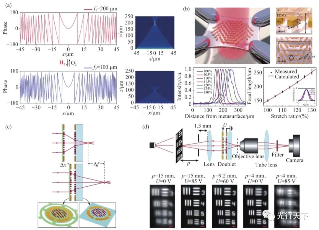 圖4. 可調(diào)及可重構(gòu)超表面透鏡設(shè)計(jì)。(a)氫化反應(yīng)前后超表面透鏡的相位分布以及對(duì)應(yīng)的電場(chǎng)強(qiáng)度分布。(b)可拉伸PDMS襯底超表面示意圖(上),納米棒的長(zhǎng)、寬、高以及埋入深度分別為l=240 nm, w=100 nm, h=70 nm, and d=200 nm。不同拉伸比s對(duì)應(yīng)的透射圓偏振光沿光軸的強(qiáng)度分布(左下)以及焦距測(cè)量值和計(jì)算值(右下)。(c)可調(diào)級(jí)聯(lián)超表面透鏡示意圖。該超表面透鏡由一片固定透鏡和一片可移動(dòng)透鏡構(gòu)成。(d)超表面級(jí)聯(lián)透鏡成像裝置示意圖(上)及不同外加電壓和成像距離p對(duì)應(yīng)的成像效果(下)
