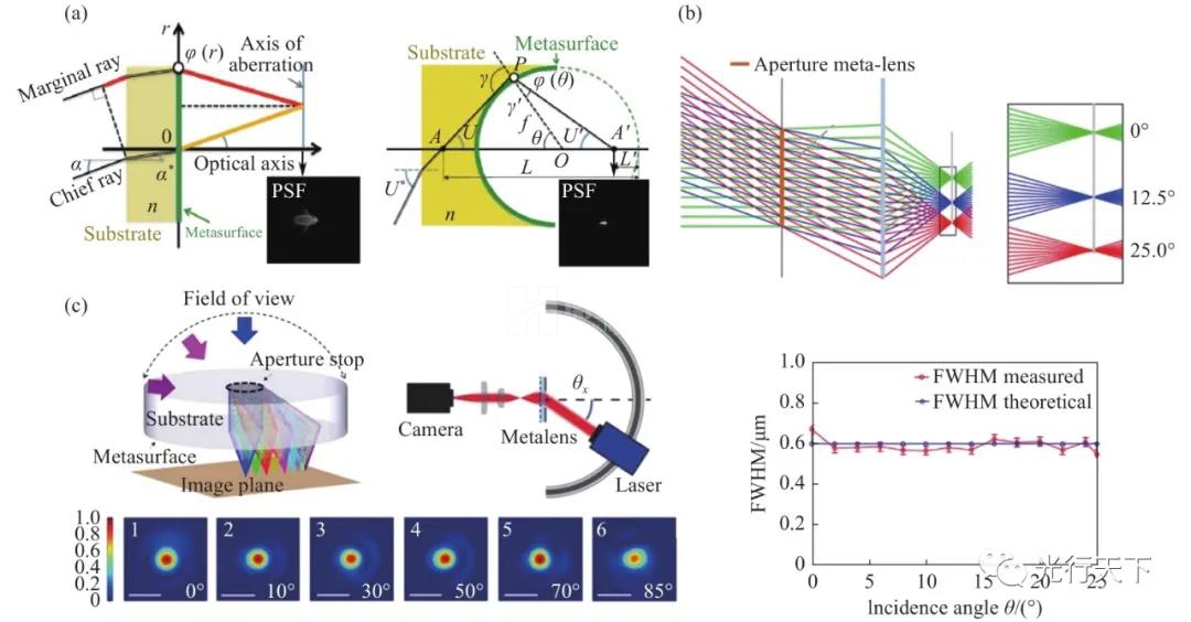 圖2. 消軸外像差超表面透鏡設(shè)計(jì)。(a)平面超表面透鏡(左)和彎曲基板超表面透鏡(右)示意圖及二者在中心波長(zhǎng)1.55 μm、入射角10°條件下的點(diǎn)列圖(PSF)。(b)級(jí)聯(lián)透鏡校正剩余球差原理示意圖(上)及不同角度入射光下級(jí)聯(lián)透鏡聚焦光斑的FWHM測(cè)量值(下)。(c)超大視場(chǎng)角單層平面超表面透鏡示意圖(左上)、用于測(cè)量不同入射角下聚焦光斑的實(shí)驗(yàn)裝置示意圖(右上)和不同角度入射光下的聚焦光斑測(cè)量結(jié)果(下)。