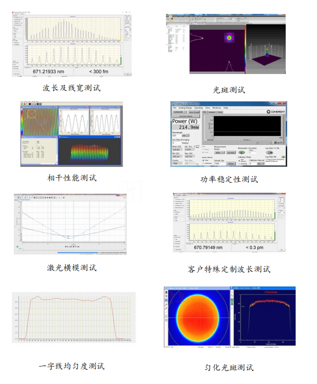 根據紅光連續(xù)激光器的光學指標,劃分單頻(單縱模)、低噪聲、窄線寬、長相 干、高穩(wěn)定性、特殊定制波長、一字線及光纖耦合勻化光斑激光器等類型。以下為部 分出廠檢測數據: